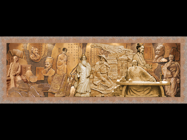 這個銅浮雕墻是為安徽金馬藥業設計的大門墻壁裝飾浮雕設計方案。以我國歷史上著名的醫者人物為主要雕刻對象,配以古文字、圖案、書卷等古代物品突出了醫藥的主題并彰顯了公司的歷史文化和傳統。